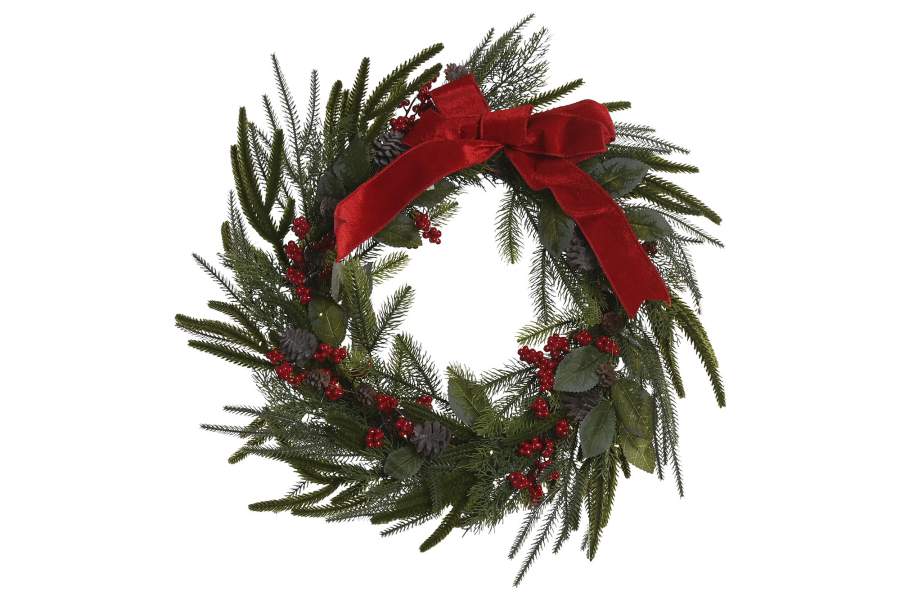 Traga o charme do Natal para a sua casa com esta coroa decorativa de 60 cm, pensada para criar ambientes acolhedores, elegantes e cheios de tradição. Combinando ramos verdes de aspeto natural, bagas vermelhas, pinhas e um laço em veludo bordô, esta peça é perfeita para dar um toque festivo a portas, entradas, salas ou montras.