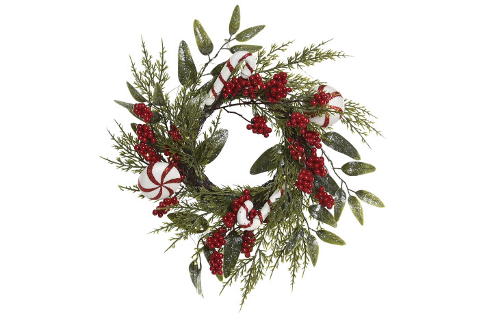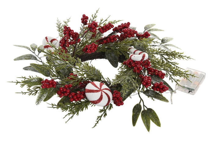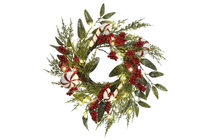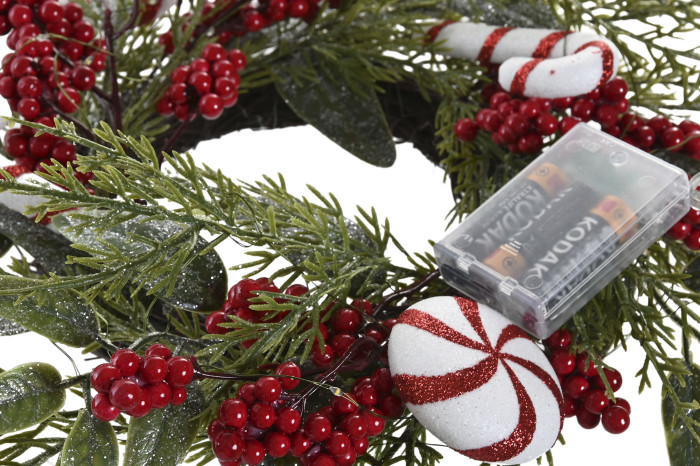 Ilumine a sua decoração com esta coroa natalícia LED de 46 cm, uma peça charmosa e perfeita para trazer o espírito de Natal a qualquer espaço. Com ramos verdes em PVC de aspeto natural, detalhes em bagas vermelhas, folhas e elementos decorativos brancos, esta coroa cria um visual tradicional com um toque doce e contemporâneo.