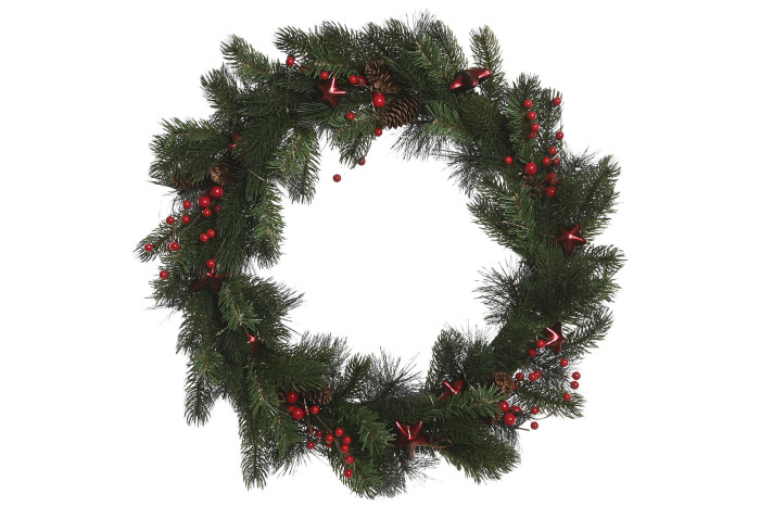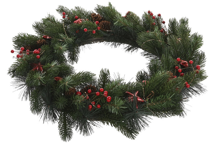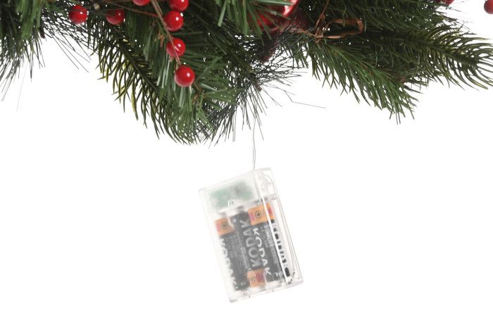 Ilumine o seu ambiente natalício com esta coroa decorativa de 60 cm com luzes LED, ideal para portas, paredes, entradas ou qualquer cantinho que precise de um toque festivo. Com ramos em PVC verde de aspeto natural, bagas vermelhas e iluminação discreta, esta peça cria um efeito acolhedor e elegante.
